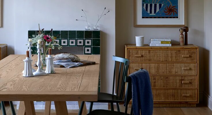 A Thirties store counter acts because the kitchen island, reclaimed boards from previous science labs turned cabinetry, and classic items have been woven all through, from the bamboo chests flanking the hearth to a Facebook Marketplace pendant above the eating desk. It’s these moments that lend the house a lived-in really feel, as if it has developed slowly over time reasonably than been freshly reworked.