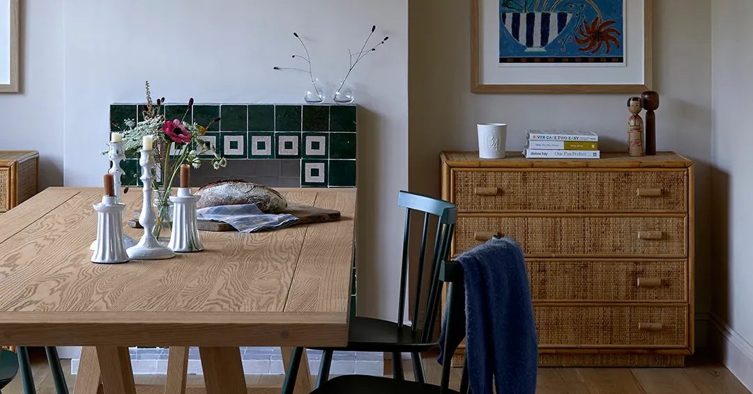 A Thirties store counter acts because the kitchen island, reclaimed boards from previous science labs turned cabinetry, and classic items have been woven all through, from the bamboo chests flanking the hearth to a Facebook Marketplace pendant above the eating desk. It’s these moments that lend the house a lived-in really feel, as if it has developed slowly over time reasonably than been freshly reworked.