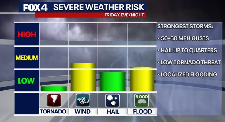 On Saturday morning, a chilly entrance will transfer by way of the area, bringing heavy rain and thunderstorms. While the extreme climate menace is low, the chance of flooding will enhance. North Texas will dry out and funky off behind the entrance by Saturday afternoon.