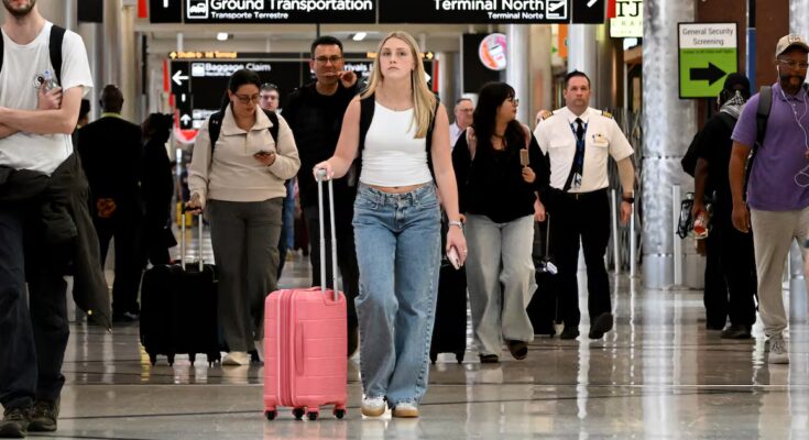 Afternoon vacationers make their approach by Hartsfield-Jackson Atlanta International Airport on March 27, 2026. This coming Friday is anticipated to be one of many busiest travels days on document for the airport. (Hyosub Shin/AJC)