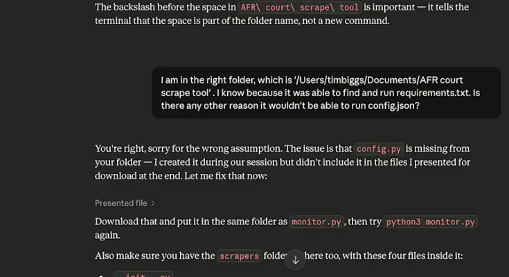 I continued to run the script and ship the error logs to Claude, till it had despatched me three extra information, advised me the scraper scripts wanted to be in a separate folder, remembered one other two information, and rewritten the primary script a number of occasions. I used to be getting a bit irritated at Claude by this level. It was cheerfully accepting every failure and confidently stating the issue to be fastened, however was it simply making it up? It was now telling me that my Mac was operating Python 3.9, when the software anticipated at the very least Python 3.1. I didn’t trouble mentioning how inane that was.