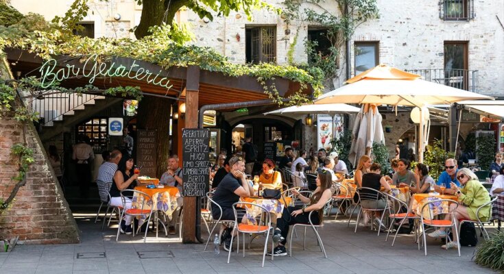 People enjoying aperitivo at an outdoor gelateria shaded by trees in Sirmione, Italy