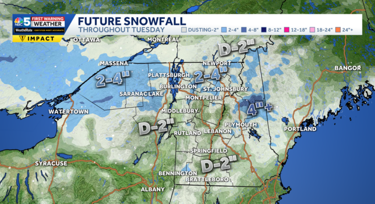 NBC5 meteorologists are monitoring a clipper system set to deliver a light-weight accumulation of snow to Vermont and Northern New York Tuesday.A burst of regular snow arrives in the course of the Tuesday morning commute.While snowfall charges should not be heavy, air temperatures shall be chilly sufficient to assist a light-weight accumulation of snow on roadways early. Slick journey is feasible in the course of the morning commute.Roads flip moist by afternoon, with a transition to mountain snow showers and drier circumstances, plus some breaks of solar, returning for the PM commute.A basic dusting to 2 inches of accumulation is predicted by Tuesday night, with regionally greater quantities attainable within the northern mountains.Later this week, a hotter sample change arrives! After a vibrant and chilly Wednesday, temperatures rebound to the 60s because the weekend approaches. For the most recent climate protection on your space, click on right here. Stay up to date with alerts within the myNBC5 app, which you’ll be able to obtain right here.For the most effective climate info and Vermont and northern New York’s Certified Most Accurate forecast, watch NBC5 News by streaming at this hyperlink.Don’t neglect to comply with NBC5 News on Facebook, X (previously Twitter), and Instagram.Follow the NBC5 First Warning Weather group on social media:Chief Meteorologist Tyler Jankoski Facebook | X | InstagramMeteorologist Ben Frechette Facebook | X | InstagramMeteorologist Matt DiLoreto Facebook | XMeteorologist Andrew Grautski Facebook | XMeteorologist Marissa Vigevani Facebook | X