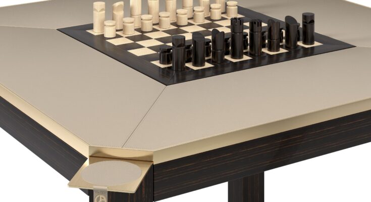 Armani Casa has all the time had a playful streak: earlier game-inspired designs embody an ebonized oak card desk with folding sleeves; a graphic walnut and lacquer facet desk with stripy sq. legs; and a big plaid adorned with a chessboard in ivory and brown and accompanying folding felt chess items.