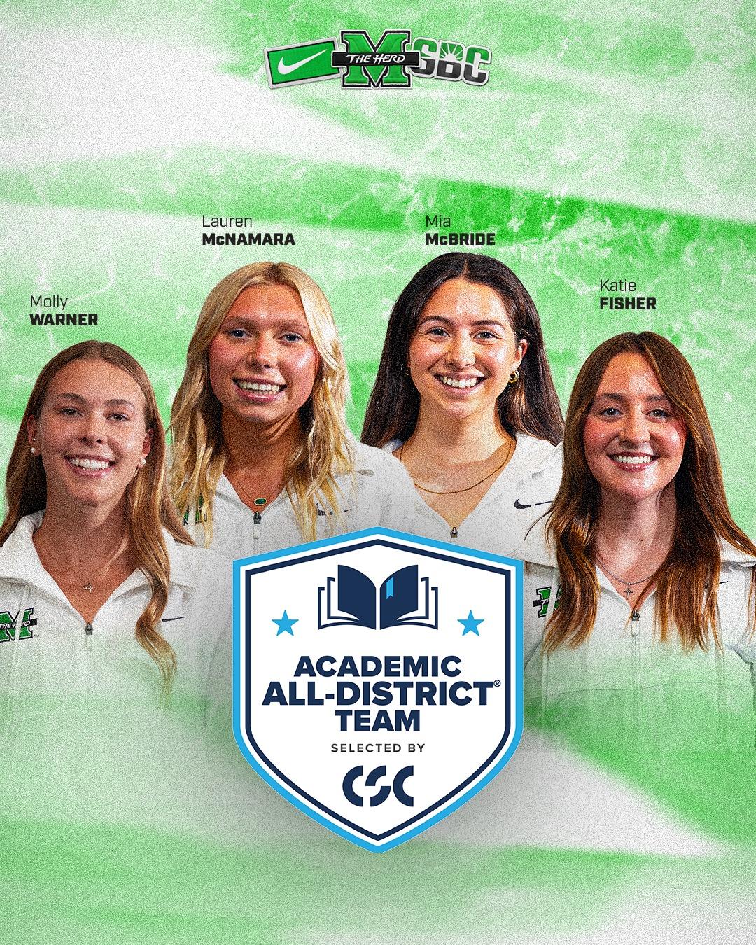 HUNTINGTON, W.Va. – Herd Swimming and Diving student-athletes Katie Fisher, Mia McBride, Lauren McNamara and Molly Warner had been named to the College Sports Communicators (CSC) Academic All-District Team on Tuesday, as introduced by CSC.