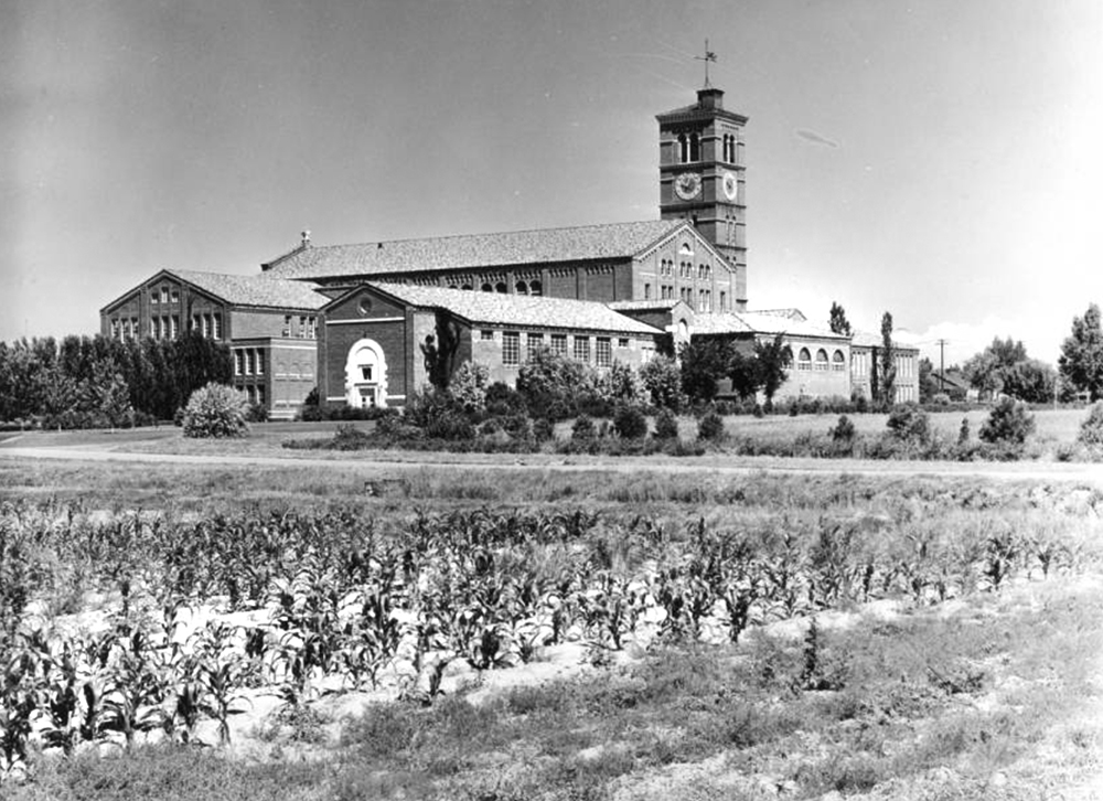 Exterior view of the again of South Denver High School. In the foreground of the image a small crop of corn is rising. (Denver Public Library/Western History Collection/C Photo191)