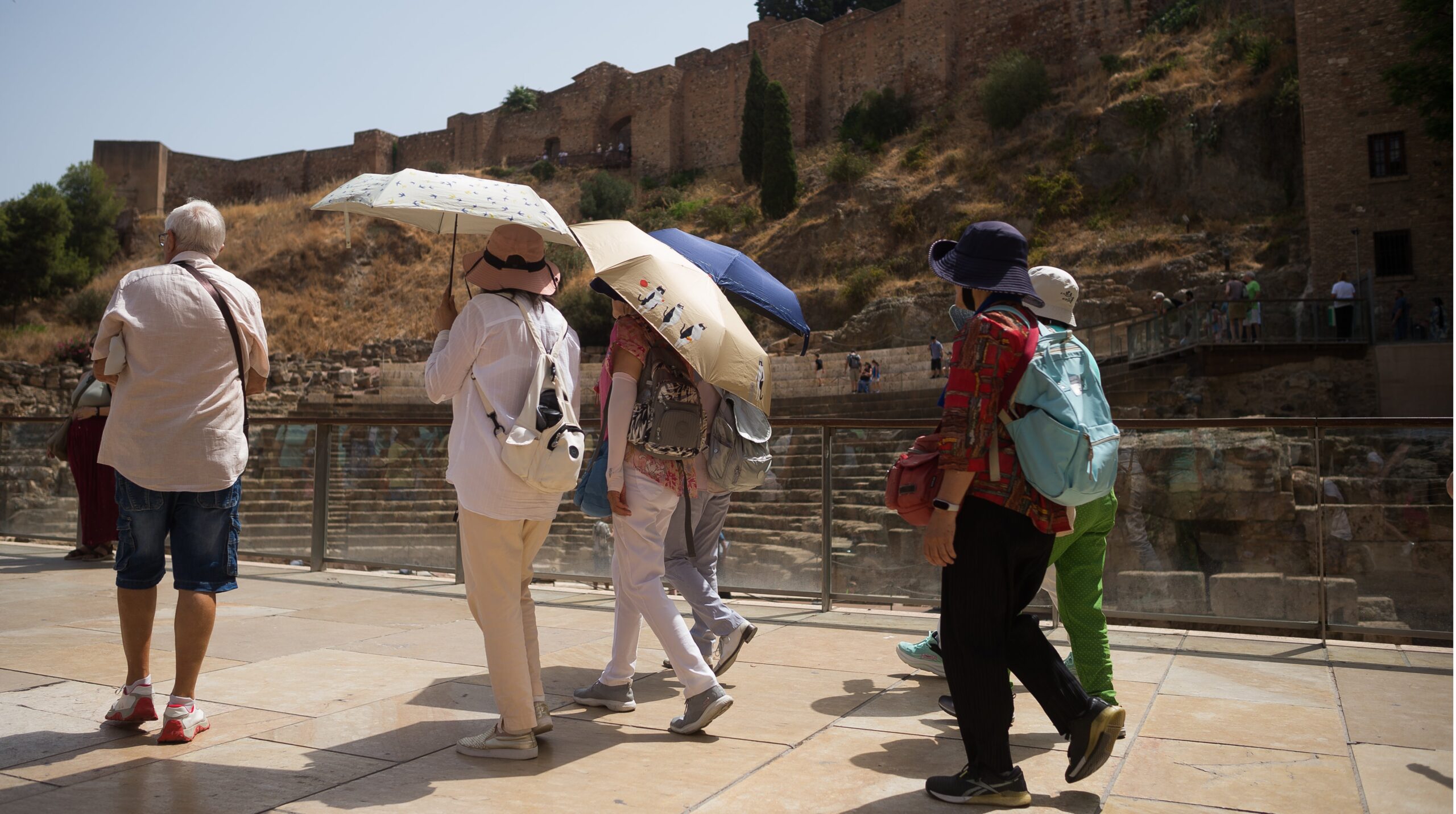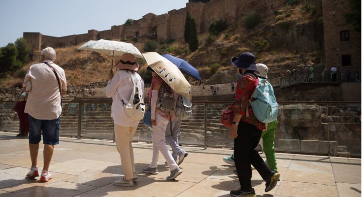 Tourists put on hats and carry umbrellas for defense as they go to the Acropolis throughout the worst heatwave of the season in Athens, Greece, on July 22, 2025.