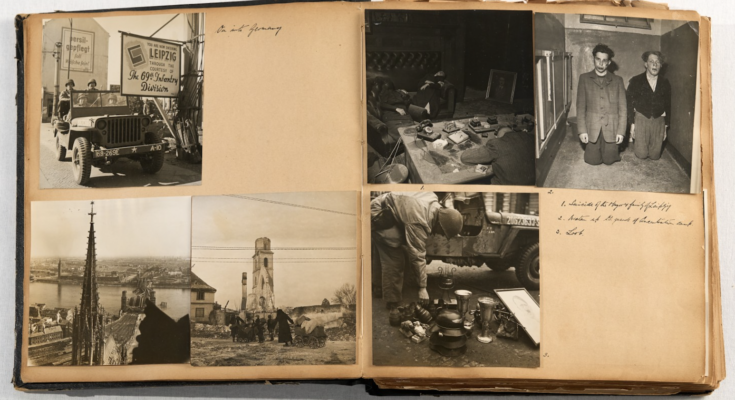Among the images is an alternate version of David E. Scherman’s iconic photograph of Miller bathing in Hitler’s personal bathtub in Munich, one of the most reproduced photographs of the war. The album’s version is previously unpublished, as are a number of other prints.