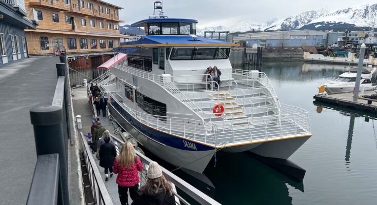 Day cruisers stroll down the ramp in Seward to board the Skana for a four-hour wildlife tour of Resurrection Bay. (Photo by Scott McMurren)