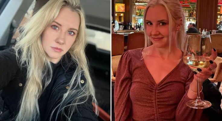 Lauren Harkins, a blonde woman with blue eyes, stares directly at the camera while wearing a black puffy coat.