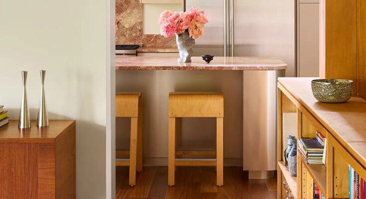 “I’m kind of obsessed with Italian rationalism,” says Hotzel, an aesthetic that leans into the thought of type following perform. “It’s warmer and has a little more depth to it than pure modernism.” So whereas the customized island’s curved stainless-steel base is a magnificence, it’s additionally match with 4 monumental drawers. The designer additionally nixed harsh angles and supplies in favor of softer touches, like pink laminate cupboard fronts from an Italian maker and unobtrusive finger pulls. No ornament for adornment’s sake right here.
