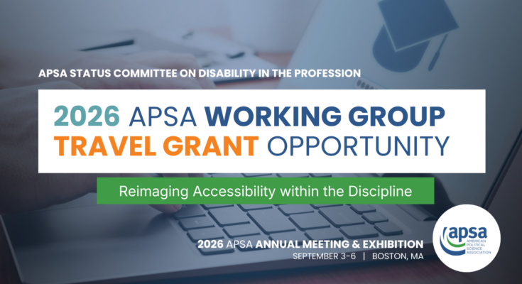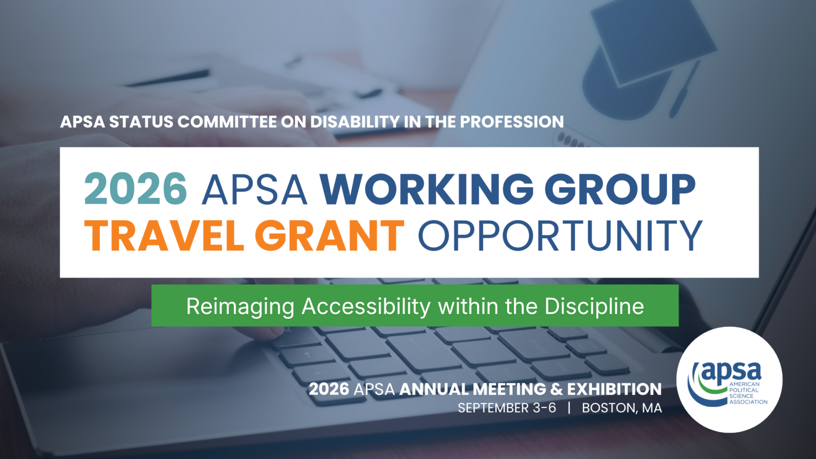 The APSA Status Committee on Disability in the Profession is holding a Working Group on “Reimagining Accessibility within the Discipline” on the 2026 Annual Meeting. Working Group functions should be submitted by May 15, 2026 11:59 PM (PT).
