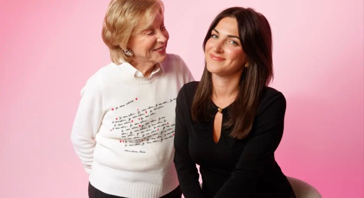 Kim Murstein and her grandmother Gail Murstein smiling for the "Excuse My Advice Podcast" with a Hermes Birkin bag.
