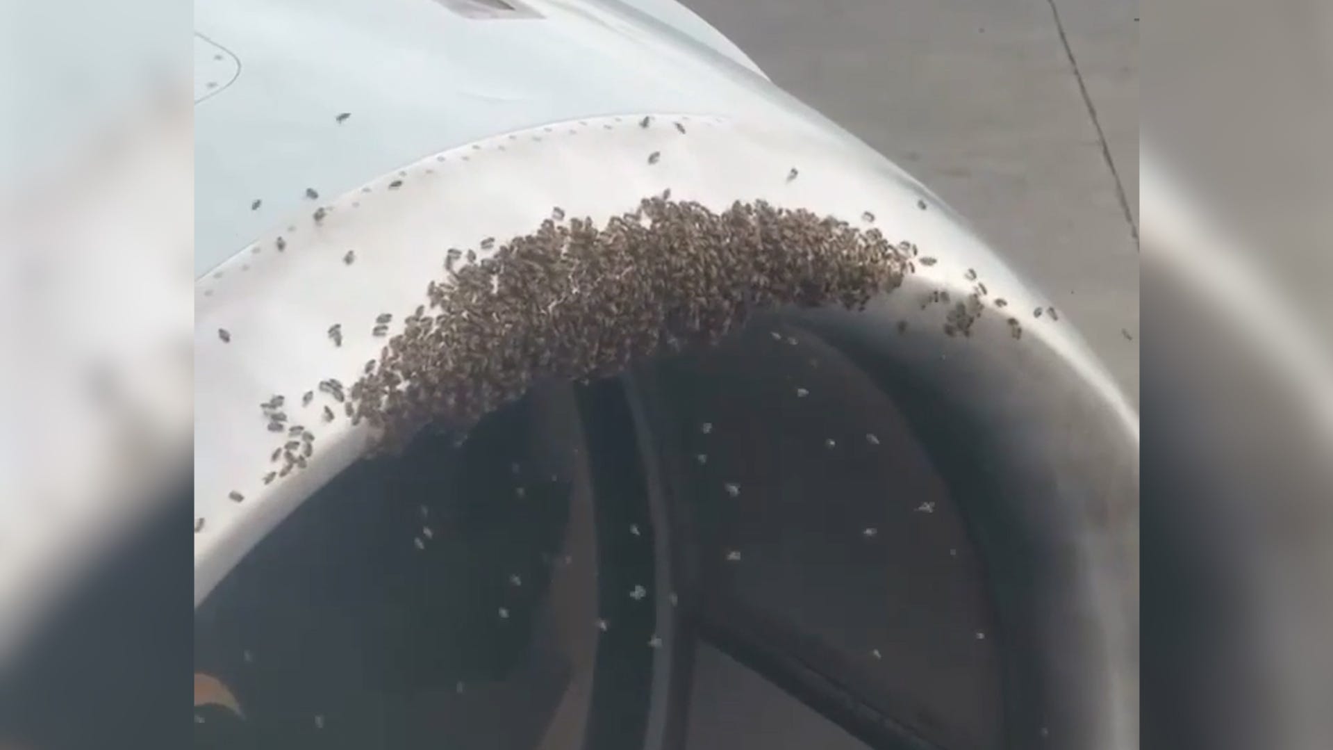 Crews delay an American Airlines flight as a beekeeper eliminated a bee swarm from a airplane turbine at Charlotte Douglas International Airport.