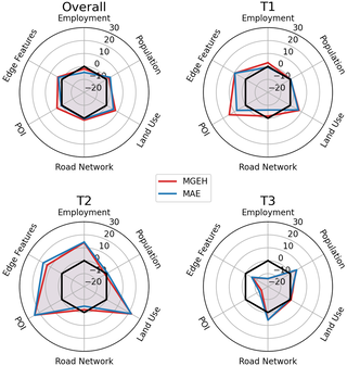 Next, we conduct a function ablation examine to judge the significance of every function set. The full mannequin, which makes use of all options, serves because the baseline. Six extra fashions are examined, every omitting one of many following options: inhabitants, employment, land use, highway community, POI, and edge options. The share change in MGEH and MAE loss values is calculated relative to the baseline, revealing the significance of every function. Fig 14 presents the radar plots summarising these modifications throughout sensors grouped by total efficiency and visitors quantity tertiles (low, medium, and excessive ranges).