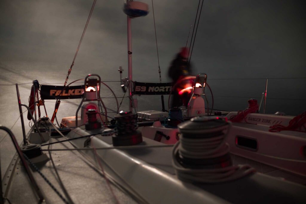 Around 1am, an hour into my watch, we had one other enormous squall. By then, we had mixed the watches from three into two, so we had extra individuals on deck. One individual stayed on the nav station to observe radar and AIS. We had a couple of ship crossings and some CPAs at a few mile or so. There was no attainable manner for us to alter course. The wind was howling, blowing nicely over 40 knots. The sky was so thick that the masthead tricolor mild was reflecting inexperienced and white mild off the rain, creating this eerie glow aloft. You might simply make out a number of the wave crests—most of which had been flattened by the sheets of rain—however in any other case there was zero distinction in any respect between sea and sky. Falken dealt with splendidly, whilst we barreled alongside and hit browsing speeds over 14 knots. The crew did a exceptional job holding course, because the stakes had been excessive. One incorrect transfer and issues can go sideways quick—don’t by chance jibe.