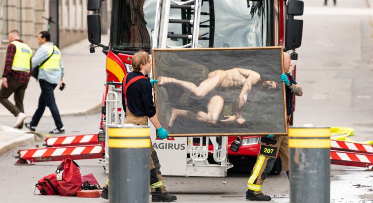 The highly effective picture, titled Saving History from the Flames, reveals two emergency responders carrying a big framed portray by the road as hearth crews labored to include a hearth on the Royal Swedish Academy of Fine Arts in Stockholm on June 7, 2025.