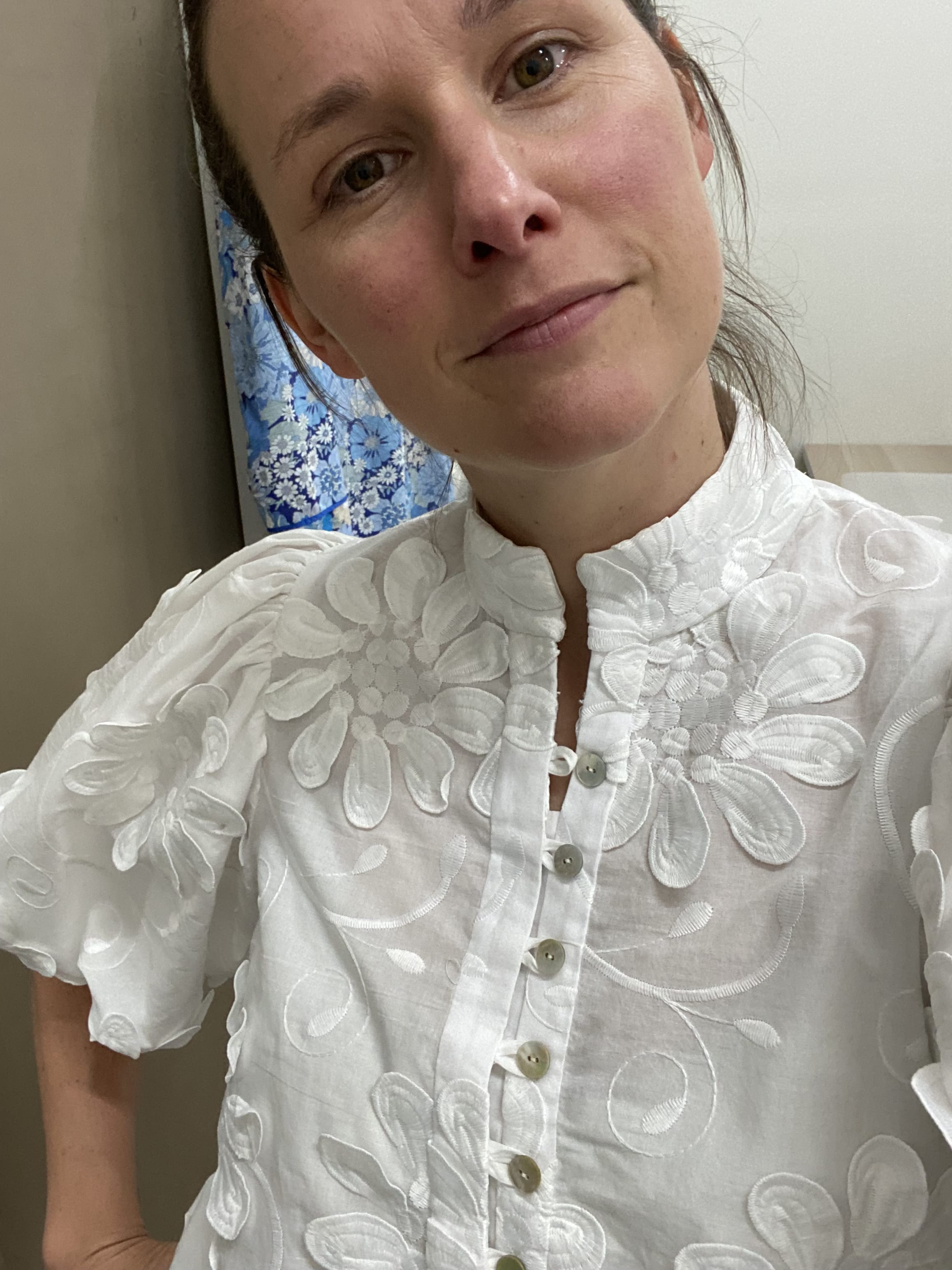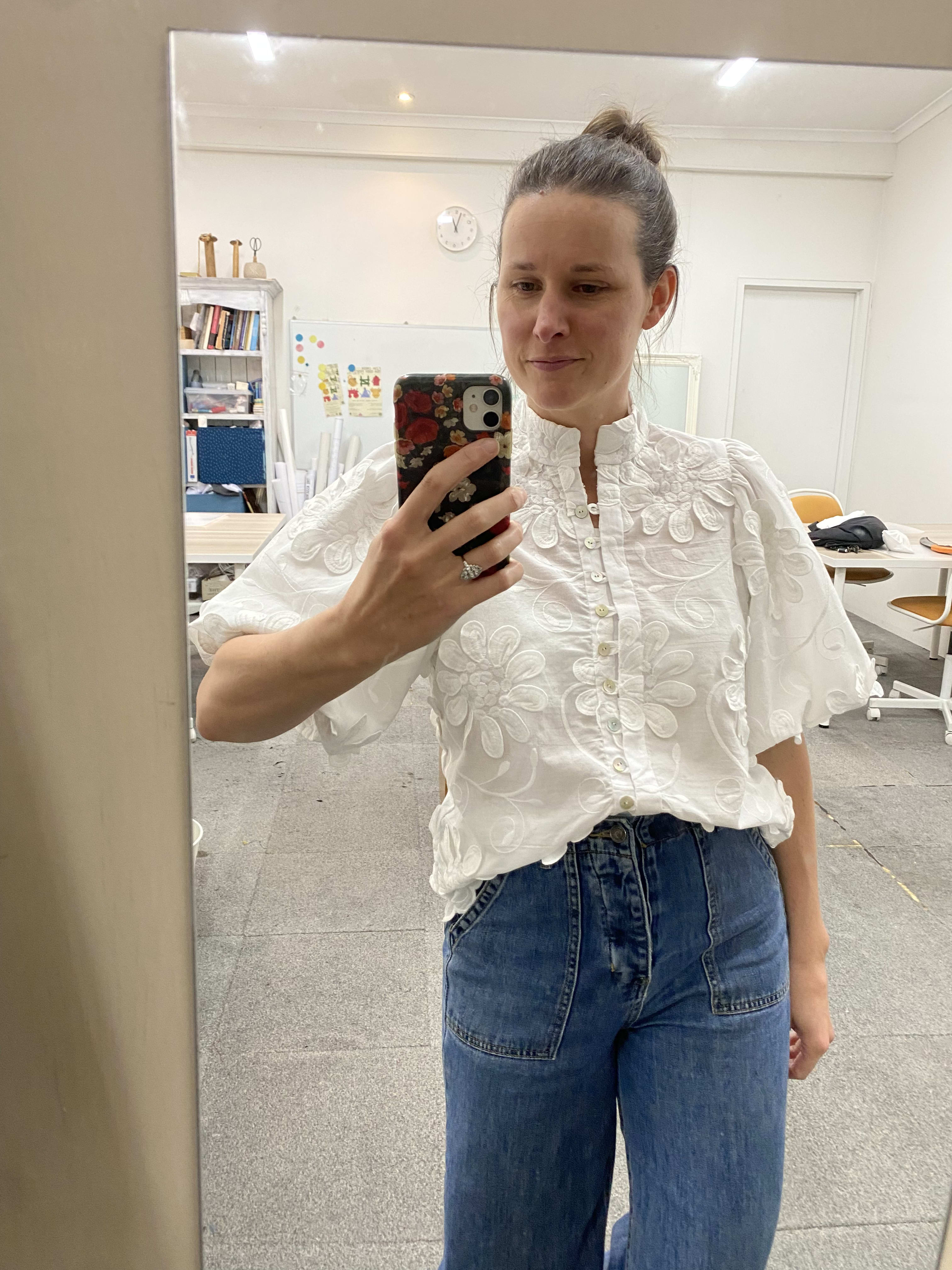 Because I’m ALWAYS making one thing with my arms. It’s how I unwind. This time, it was probably the most sophisticated shirt I’ve ever sewn. I noticed this magnificence within the window of in my new favourite material retailer. White, 3D floral print? Huge floofy sleeves? I didn’t suppose both of these had been my factor, but it surely referred to as to me. And so I attempted it on, after which…