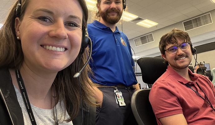 Addison McNutt (left) and teammates Evan Tingley (heart) and Colin Finley work at a supporting console at Kennedy Space Center’s Launch Control Center throughout the latest launch and mission of Artemis II. McNutt, a 2018 UM graduate, monitored the command and knowledge dealing with system on the core stage, which is actually the ‘mind’ on the rocket. Submitted photograph