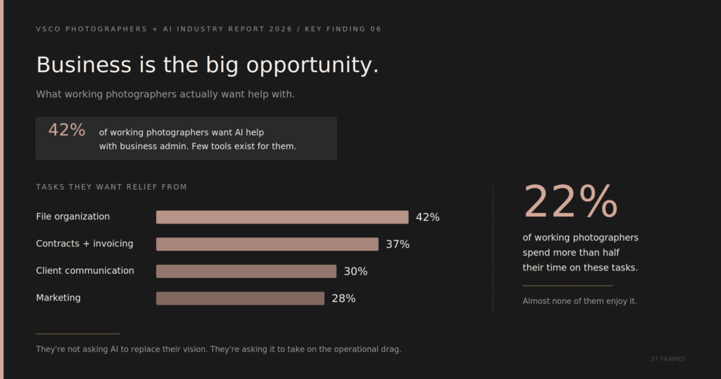 But right here’s the discovering from the VSCO report that stopped me. When working photographers describe what they really need AI assist with, the checklist doesn’t learn like a inventive temporary. It reads like a small enterprise operations guide. File group. Contracts and invoicing. Client communication. Marketing. 42% of working photographers need AI assist particularly with enterprise administration. And 22% of them are spending greater than half their working hours on duties like these. Tasks that just about none of them take pleasure in.