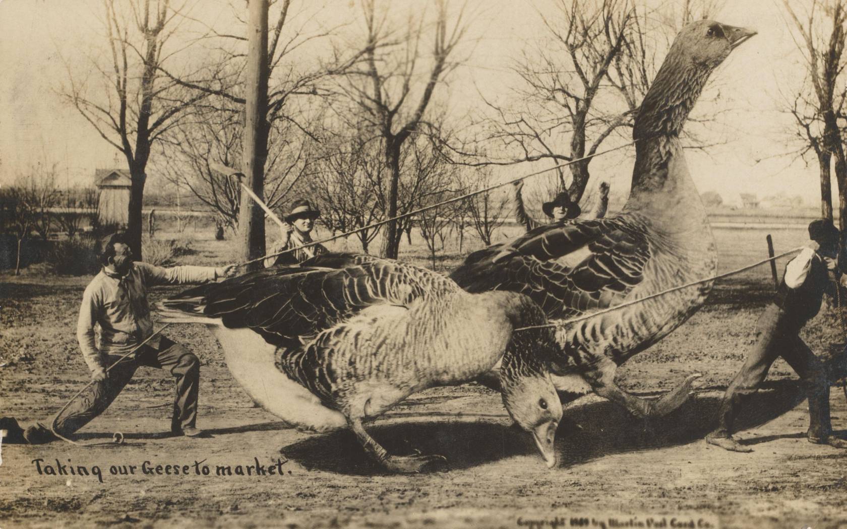 As the twentieth century dawned, the image postcard supplied a brand new automobile for photographic sleight of hand. The ‘Exaggeration’ or ‘Tall Tale’ card turned a style unto itself in North America earlier than the First World War, particularly within the Great Plains areas. Such playing cards depicted impossibly giant animals or crops being transported to market, mythologising the agricultural abundance of particular areas in a comically inflated method. In one instance, two males sit astride a gargantuan ear of corn, twice the size of the cart on which it’s being carried, whereas one other exhibits a pair of monumental geese that appear like they might eat the boys dragging them alongside for breakfast.
