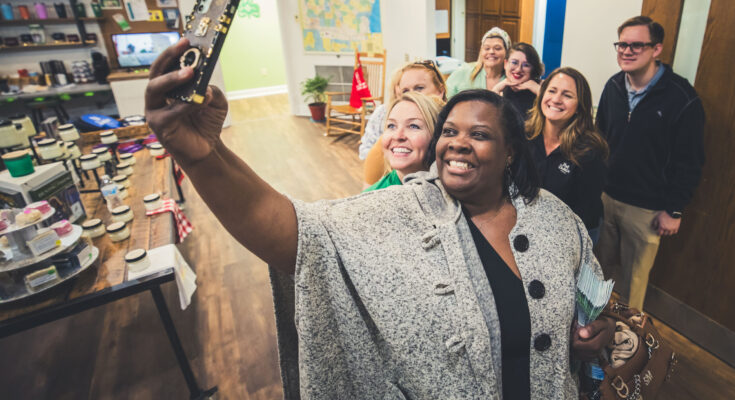 Woman takes a selfie with friends at the Dublin Visitors Center during Travel and Tourism Week