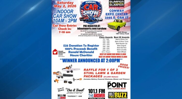 The 2026 Bumper to Bumper Annual Car Show is about for Saturday, May 2, from 10 a.m. to 2 p.m. on the Conway Expo Center. Organizers anticipate about 150 automobiles, and since it’s held indoors, the present shall be air-conditioned and protected against rain or chilly.