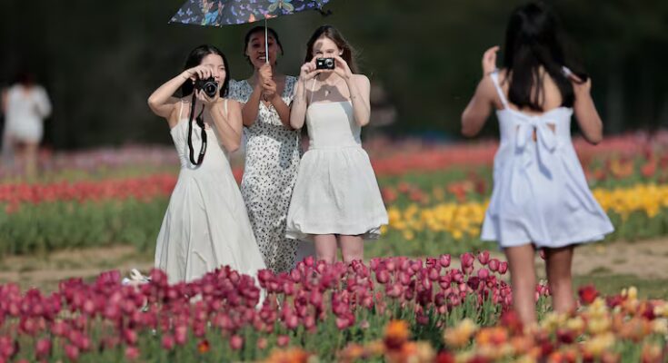 Serina Zhang, (left) Alexis Russell (holding umbrella) and Ava Eller {photograph} Alyssa Gallamoza among the many tulips through the Tri State Tulip Festival at Dalton Farms in Swedesboro, N.J. The women have been mates since center faculty in Bel Air, Maryland and drove to the tulip pageant to have a good time their school graduations.Read extraElizabeth Robertson / Staff Photographer