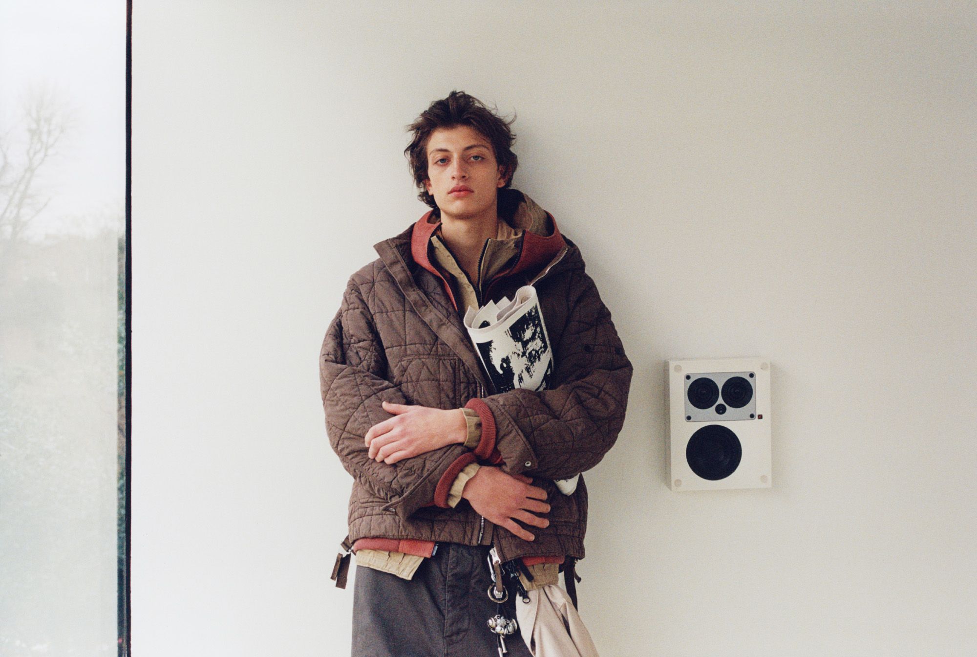Amedeo wears jacket, £1,010; jacket (beneath), £3,025; jacket (beneath), £975; shirt (round waist), £405; trousers, £350, all by Stone Island (stoneisland.com). Leather newspaper, worth on request, by JW Anderson (jwanderson.com). Keyring, £160, by Six 95 (six-95.com)