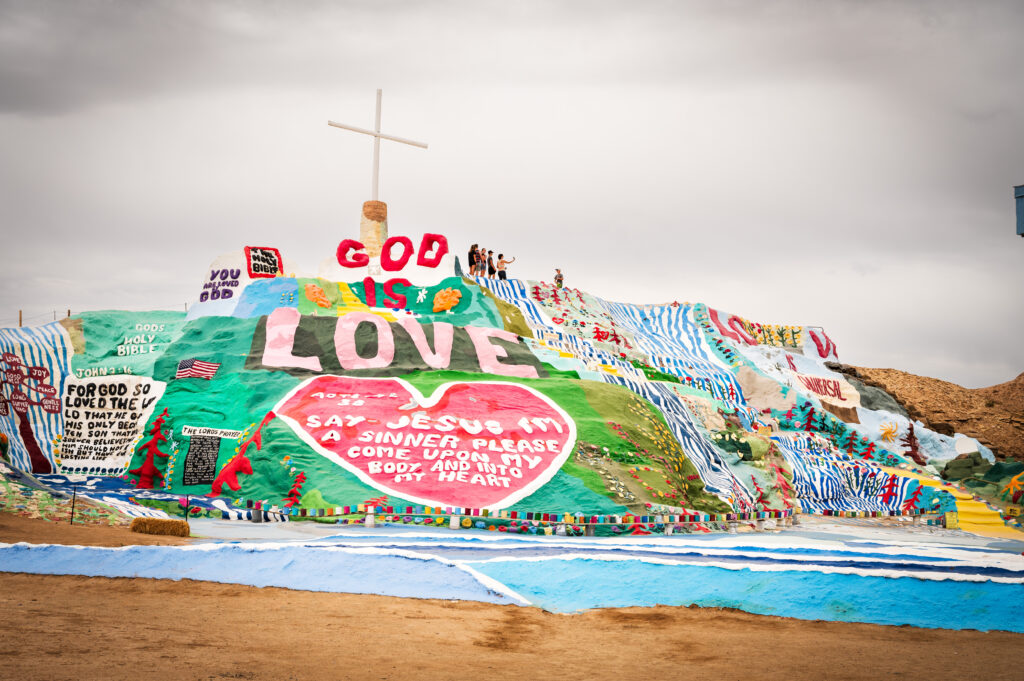 One of essentially the most well-known Slab City landmarks is Salvation Mountain, a brightly colored, Bible-themed artwork set up created by Leonard Knight. It’s the primary set up you see while you drive in from the actually unhappy native city of Niland California. At first the realm is fairly intimidating, with previous burned out camper trailers everywhere in the desert, however there’s a giant welcome signal and a car parking zone. I glided by just a few instances and located there was at all times an area Slab City resident in a security vest appearing as type of a docent for the set up. I discovered they have been a pleasant supply of native data, and so they assured me guests have been welcome by way of many of the space.