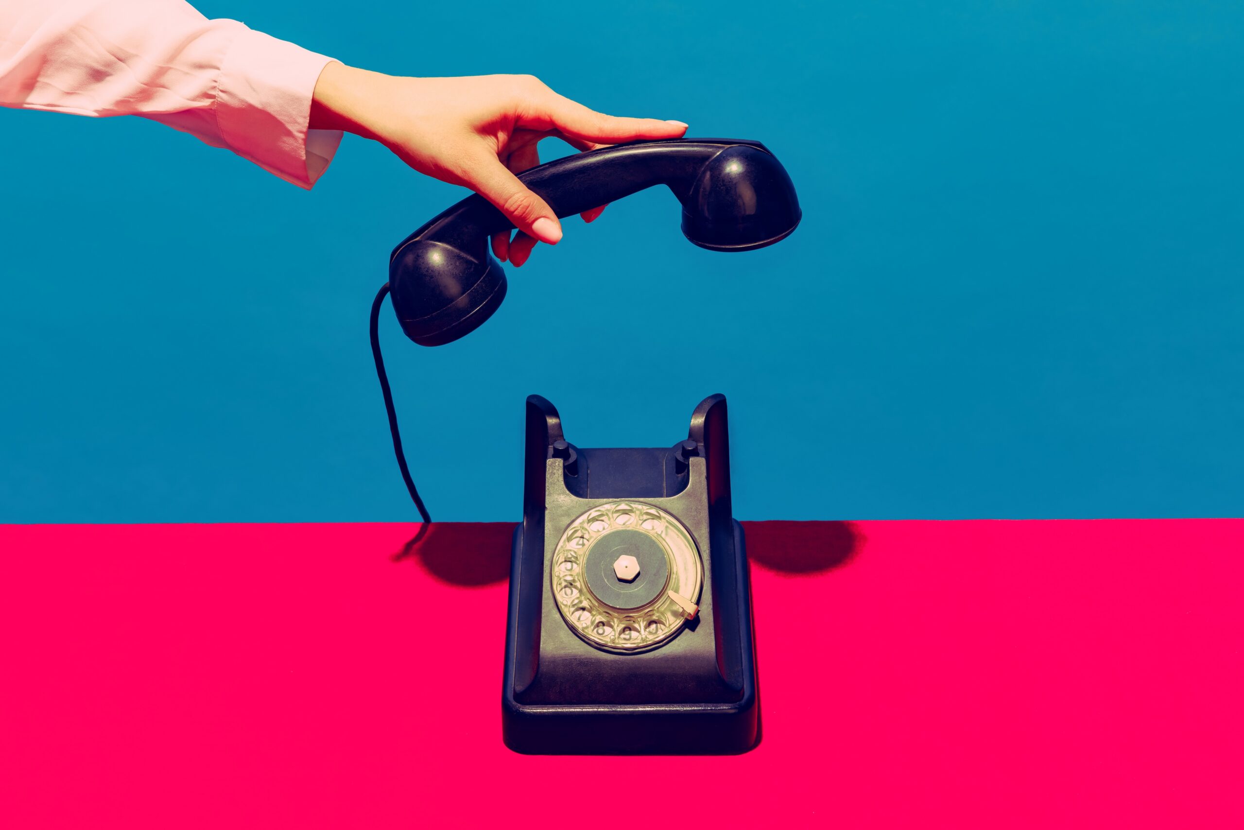 Black telephone. Retro objects, gadgets. Female hand holding handset of vintage phone isolated on blue pink background. Vintage, retro 80s, 70s style. Complementary colors. Copy space for ad, design