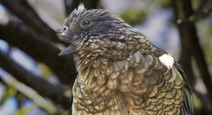 A brown and yellow Kea parrot seen in profile against a backdrop of branches, the top of its beak malformed