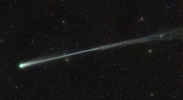 “The comet delivered a shocking look within the constellation Pegasus. A protracted, slender ion tail extends effectively over 4°, working past the sphere of view.