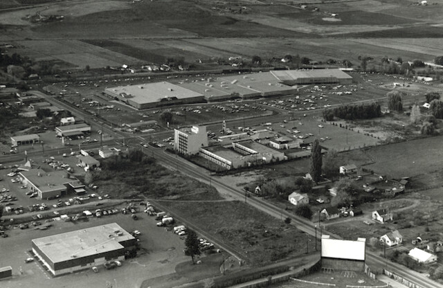 Aerial {photograph} taken by David Madison within the Nineteen Seventies, displaying the Village Green Mall, the Village Green Hotel and the Skyway Drive-In.