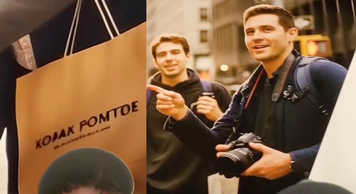Two men stand outdoors in a city; one holds a camera and points, while the other smiles. A close-up of a tan shopping bag with distorted “KODAK ROMTOE” text appears on the left side of the image.