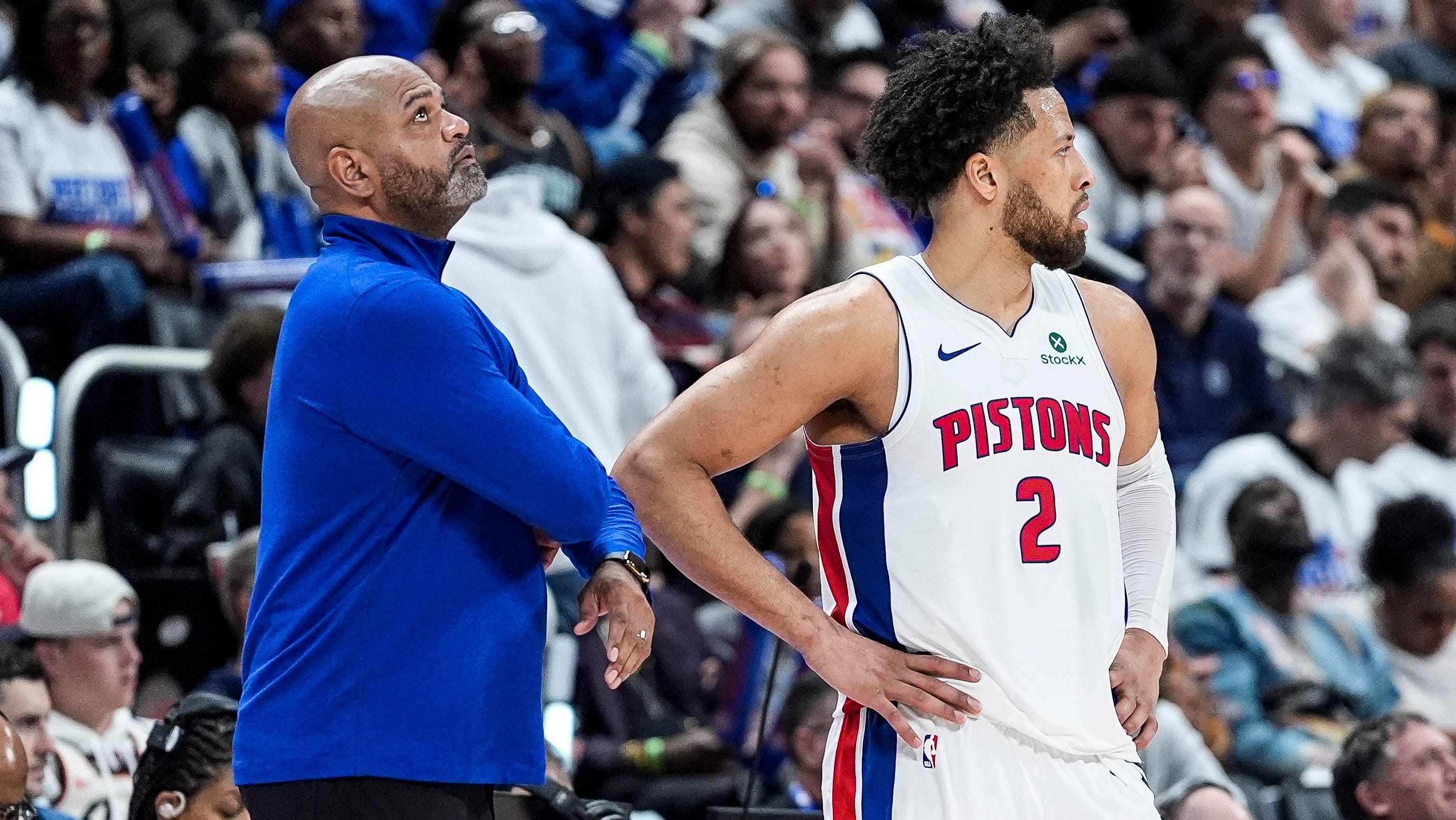 Cade Cunningham reacts to Detroit Pistons’ 112-101 loss to Orlando Magic in Game 1 of NBA playoffs, April 19, 2026 at Little Caesars Arena.