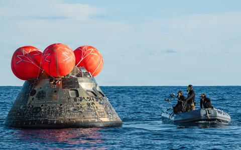 On a restoration boat transferring throughout the Pacific Ocean, MC2 David Rowe watched the Orion capsule parachute down from the sky as Navy and NASA groups moved in to start restoration operations.