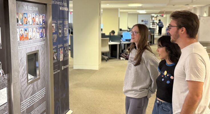 Rice University area research college students Margot Moy, Mckenzie Golden, and William Rogers examine Rice’s contributions to NASA on Feb. 19, 2026.