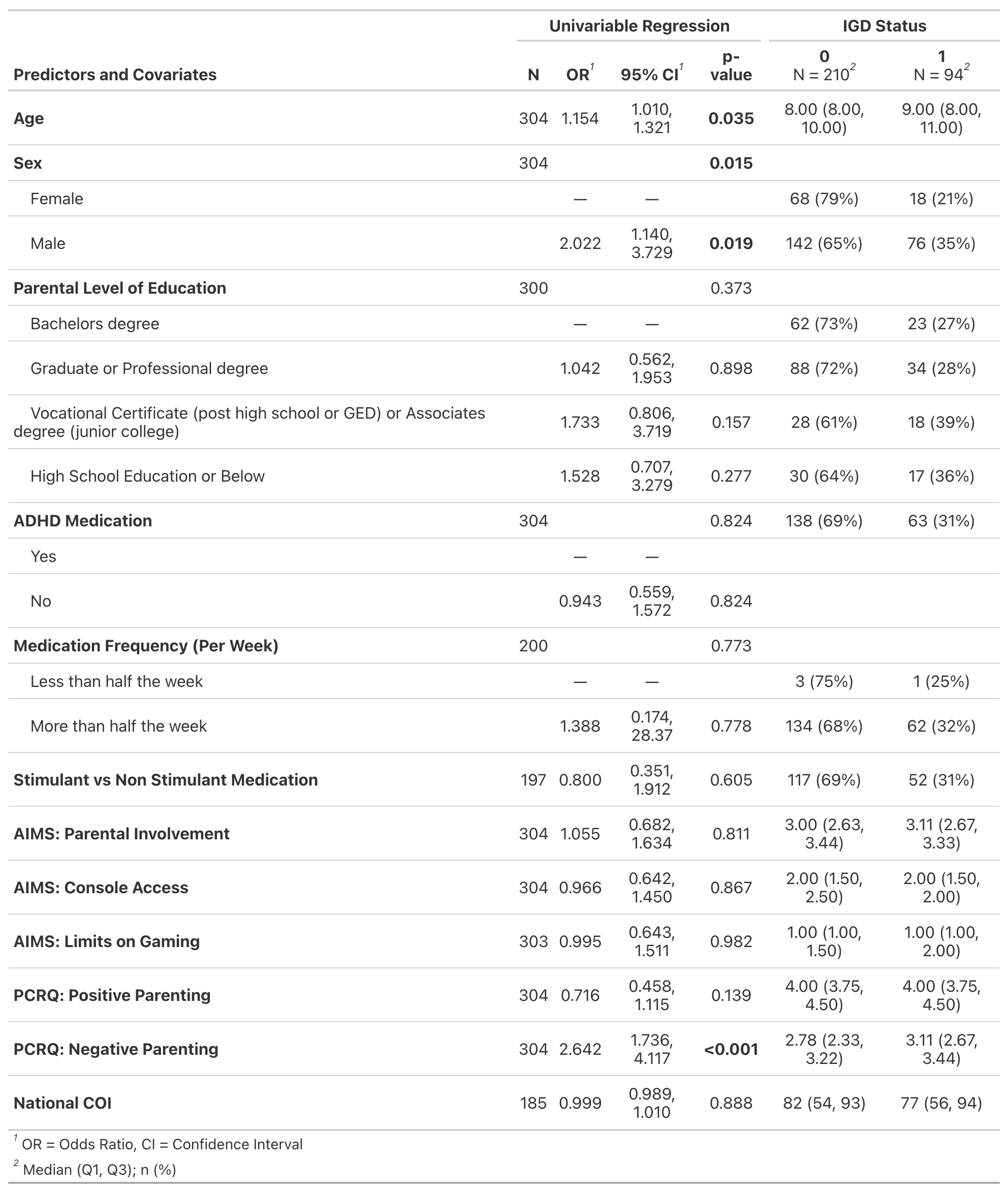 Univariable Logistic Regression Results by Internet Gaming Disorder Status