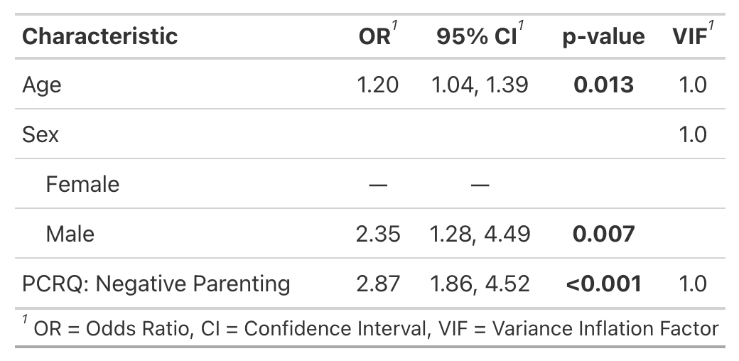 1OR = Odds Ratio, CI = Confidence Interval, VIF = Variance Inflation Factor