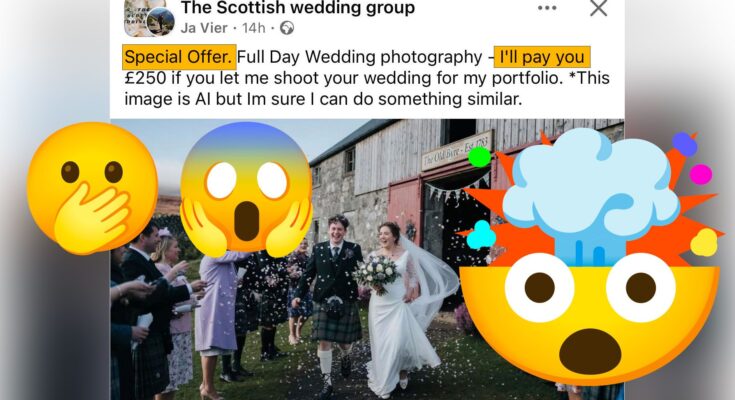 Posting on the general public Facebook group The Scottish Wedding Group, the consumer, named Ja Vier, wrote: “Special Offer. Full Day Wedding Photography – I’ll pay you £250 if you let me shoot your wedding for my portfolio.”
