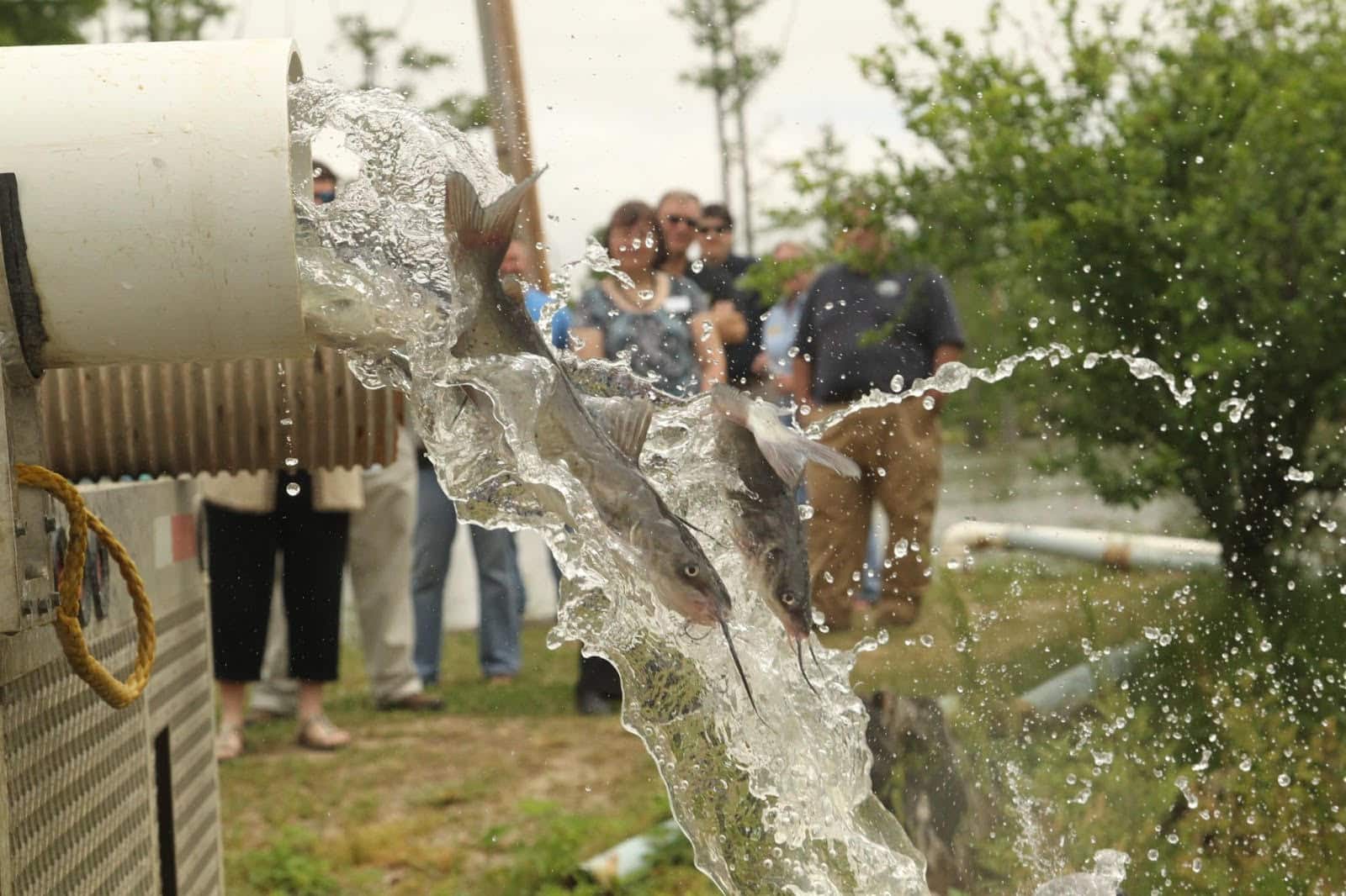 AGFC Assistant Chief of Fisheries Jason Miller reveals a faculty group how catfish are harvested from ponds to be stocked across the state. AGFC picture.