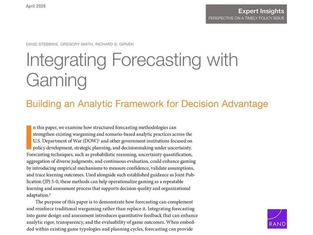 In this paper, authors discover how integrating structured forecasting methodologies inside gaming, tabletop workout routines, and different scenario-based analytic video games can strengthen decisionmaking, studying, and strategic evaluation inside U.S. protection and different nationwide safety organizations. The authors draw on findings from earlier RAND analysis efforts and different related educational work targeted on wargaming, forecasting, and analytic studying to suggest an interoperability framework that hyperlinks the narrative and experiential strengths of gaming with the rigor and empirical validation supplied by means of probabilistic forecasting. The authors display how forecasting strategies can improve present wargaming practices by advancing measurement, calibration, and evaluability inside the broader wargaming enterprise. This dialogue additionally situates forecasting inside ongoing skilled debates that body wargaming as an artwork, science, and disciplined craft, connecting artistic design with clear analytic follow.