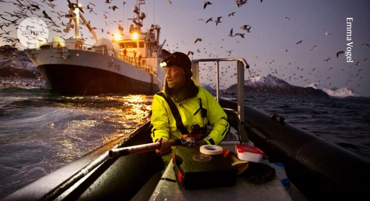 A researcher wearing high vis jacket and head torch sits in a small boat holding a wide-barrelled air gun. Behind, a fishing trawler surrounded by flocks of sea birds, and snow covered hills on the horizon.