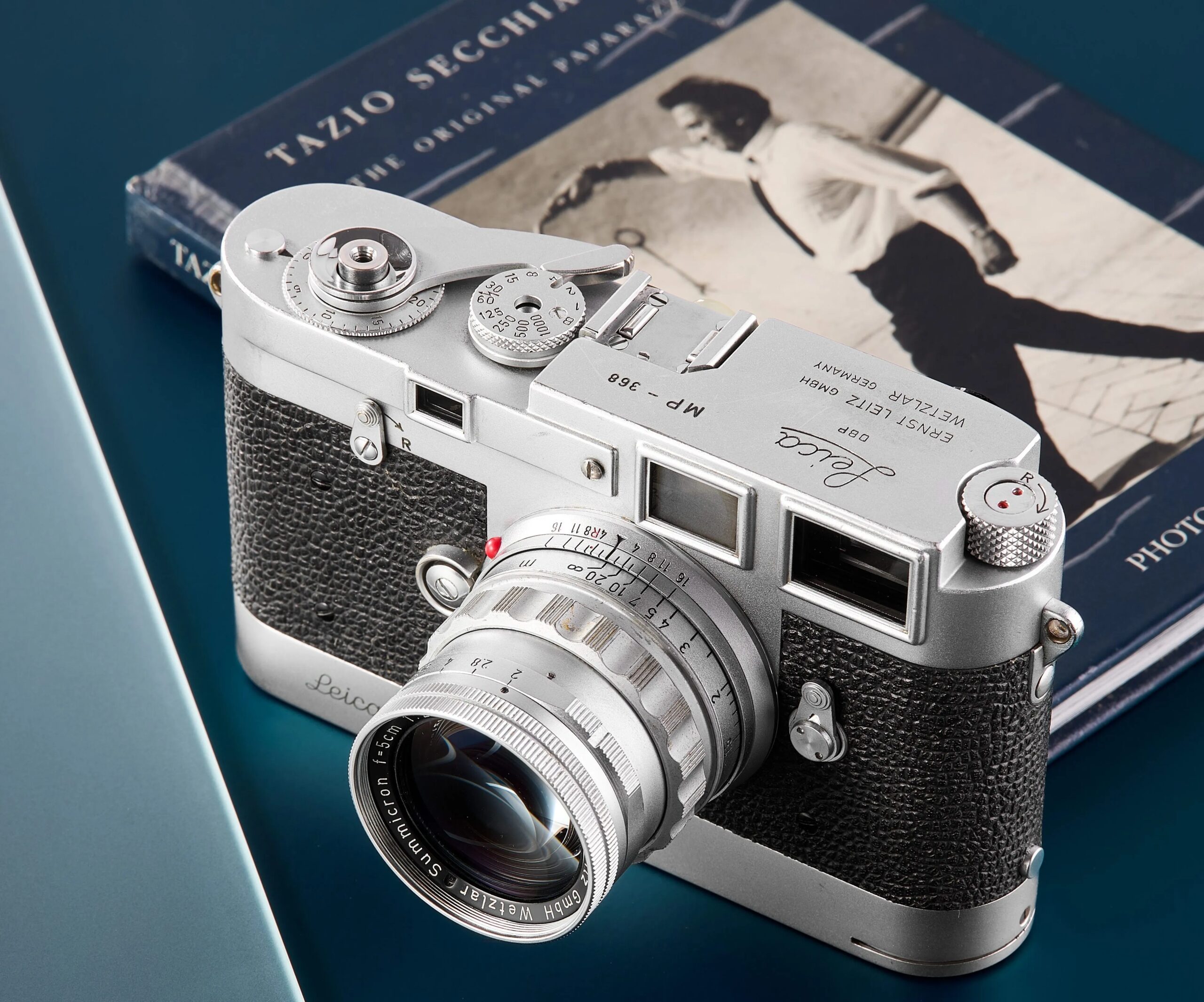 A silver Leica camera with a mounted lens rests on a teal surface beside a book titled “Tazio Secchiaroli: The Original Paparazzo,” featuring a black-and-white photograph on its cover.