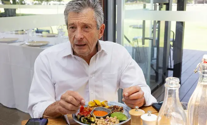 Happily, we each land on the vegetarian nourish bowl, which it seems is each scrumptious and wholesome. To drink, it’s glowing water. My days of chips, burgers and possibly a cheeky chardie or two for lunch at the moment are historical past and, by the look of Fenton, who has simply turned 74, have been by no means actually a part of his story.
