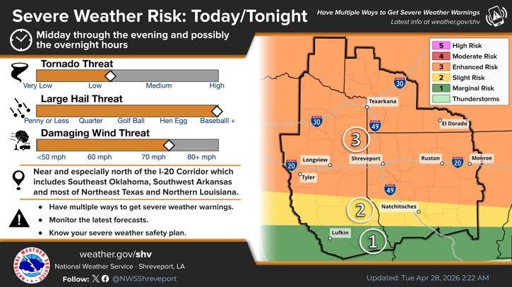 There is a danger of extreme climate impacting parts of Louisiana later this afternoon, this night, tonight, and into tomorrow. The system could produce damaging winds, remoted tornadoes, massive hail, and heavy rainfall that would result in flooding. Residents are inspired to stay climate conscious, monitor native forecasts, and have a number of strategies to obtain watches and warnings as circumstances develop.
