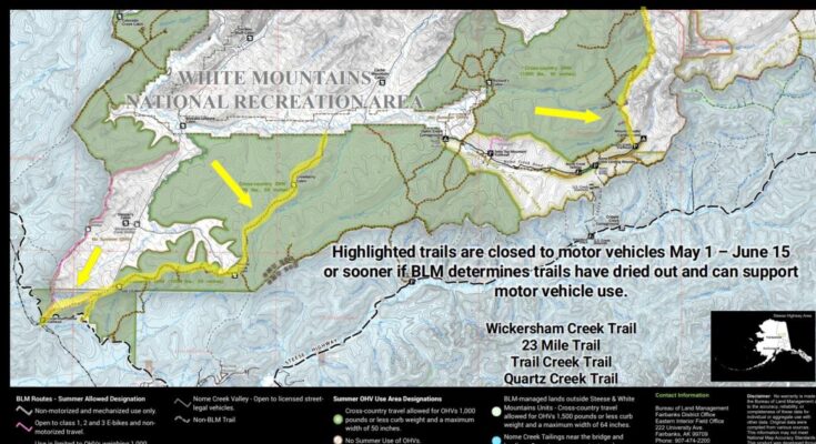 Fairbanks, Alaska –The Bureau of Land Management (BLM) Eastern Interior Field Office will start the summer time season journey limitations for the White Mountains National Recreation Area on May 1. As the summer time season journey limitations take impact, off-highway automobiles will likely be quickly restricted from the Wickersham Creek Trail, Trail Creek Trail, 23 Mile Trail, and Quartz Creek Trail to forestall harm to moist trails throughout the transition to summer time.